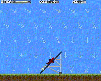 This is a simple little game where you control a steam rocket powered airplane, trying to fly as far as possible with limited amount of steam energy. The challenge is to find favourable winds to help you stay in the air longer. Yes, thanks to the ultra realistic aerodynamic simulation, you can exploit rising air currents to gain altitude while avoiding winds that push you down towards ground.